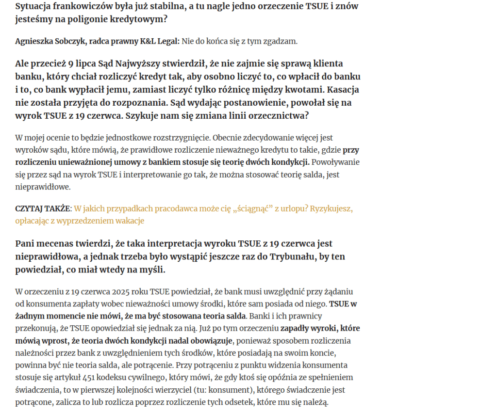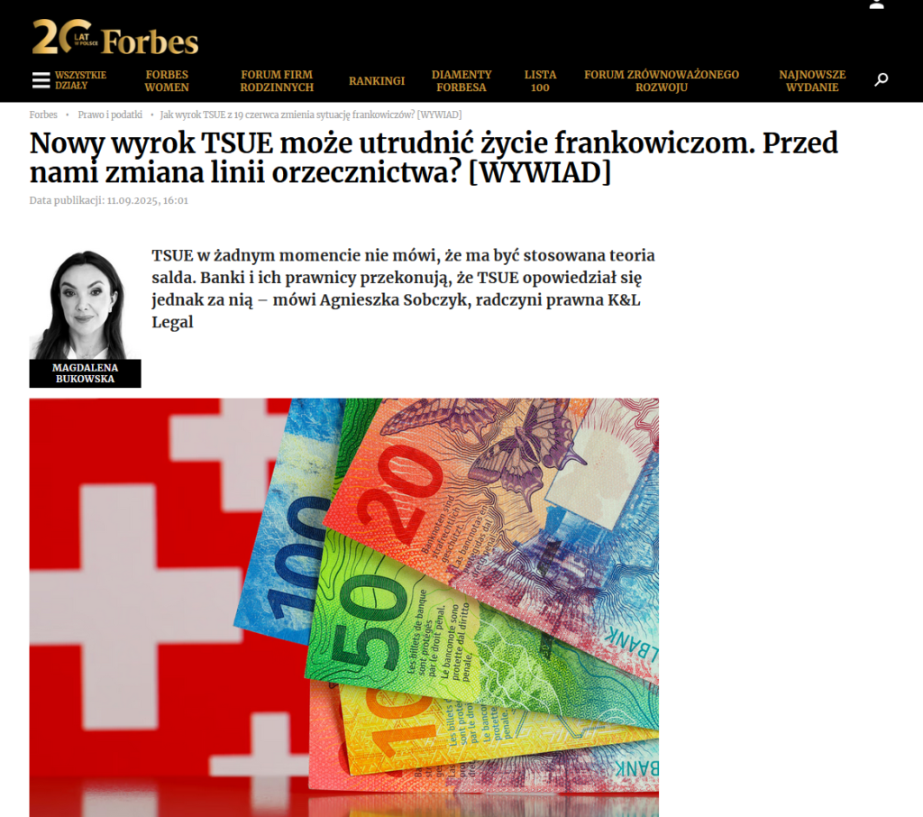 Nowy wyrok TSUE może utrudnić życie frankowiczom. Zagadnienie dla FORBES komentuje mec. Agnieszka Sobczyk
